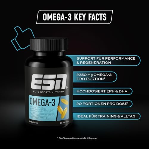 Details: ESN Omega-3, 60 Kapseln, hochdosiertes EPA & DHA, unterstützt Herz, Gehirn & mehr, 1200 mg EPA & 900 mg DHA pro Portion, regelmäßig geprüft – made in Germany