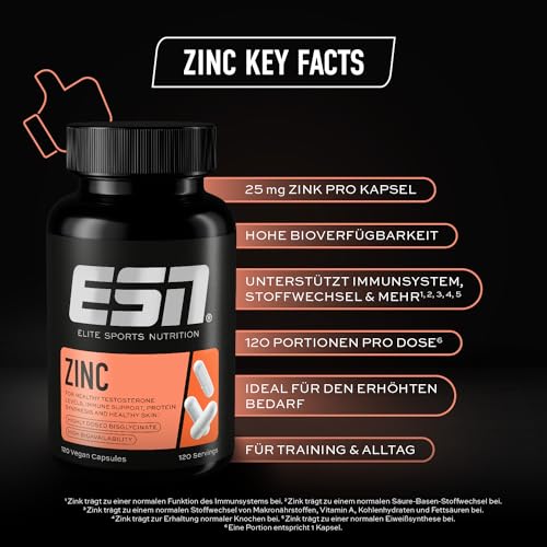 ESN Zinc, 120 Kapseln, Zinkbisglycinat, 25 mg Zink pro Kapsel, für dein Immunsystem, vegan, geprüfte Qualität – made in Germany