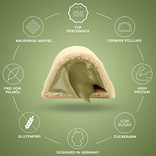 Cremefüllung Typ PISTAZIE (56%) (Süßungsmittel (Maltit), Eiweißmischung (Molkeneiweißisolat (MILCH), SOJAeiweißisolat), pflanzliche Fette (Kakaobutter, Sheabutter), PISTAZIENpaste (15%), pflanzliche Öle (Sonnenblumenöl, Safloröl), Emulgator (Lecithine), Aromen), weiße Schokolade mit Süßungsmittel (11,9%) (Kakaobutter, VollMILCHpulver, Emulgator (Lecithin (SOJA)), Süßungsmittel (Maltit), natürliches Vanille-Aroma), Kollagenhydrolysat (Rind), Kakaobutter, MILCHeiweiß, Reismehl, Kartoffelstärke, Maisstärke, Sonnenblumenöl, Emulgator (Lecithine), Quinoamehl, Backtriebmittel (Natriumbicarbonat, Ammoniumbicarbonat). Kann Spuren enthalten von EI, ERDNÜSSEN und ANDEREN SCHALENFRÜCHTEN.