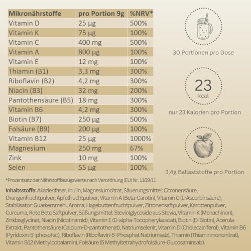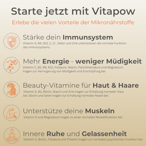 Ganzheitlich versorgt & wohlfühlen – Vitapow enthält Vitamin A, B1, B2, B3, B5, B6, B7, B9, B12 (Vitamin B Komplex), C, D, E, K, Magnesium, Zink, Selen, Extrakte & Pulver aus Orange, Apfel, Zitrone, Karotte, Rote Bete, Kurkuma, Hagebutte, Acerola Kirsche.