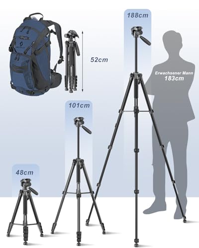 188 cm leichtes Stativ: Dies ist ein leichtes Stativ mit einer höhenverstellbaren Reichweite von 50,8 bis 188 cm und mit einem Handyhalterung, geeignet für Kameras und Smartphones. Zum leichteren Transport kann es auf nur 19 Zoll zusammenklappen, was es ideal für häufige Wechsel der Aufnahmestelle und für Reisen macht. Obwohl es nur 1,27 kg schwer ist, kann es Gewichte bis zu 2,2 kg tragen.