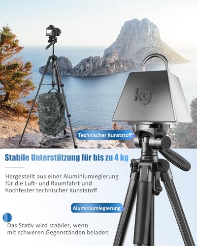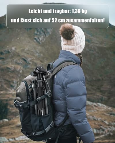 Stabilfes Reisestativ:Dieses Stativ besteht aus robustem technischem Kunststoff und einer leichten Aluminiumlegierung und bietet Stabilität, ohne aufzutragen. Es bleibt auch bei milder Außenbrise (bis zu Windstärke 3) belastbar und verfügt über einen Haken an der Basis der Mittelsäule zum Anbringen von Gewichten, wodurch die Stabilität auch bei kleineren Stößen verbessert wird